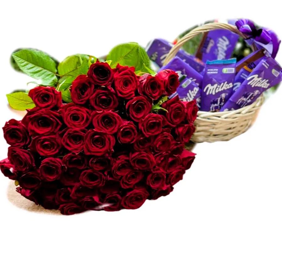 51 красная роза и корзина со сладостями: выразите свои чувства