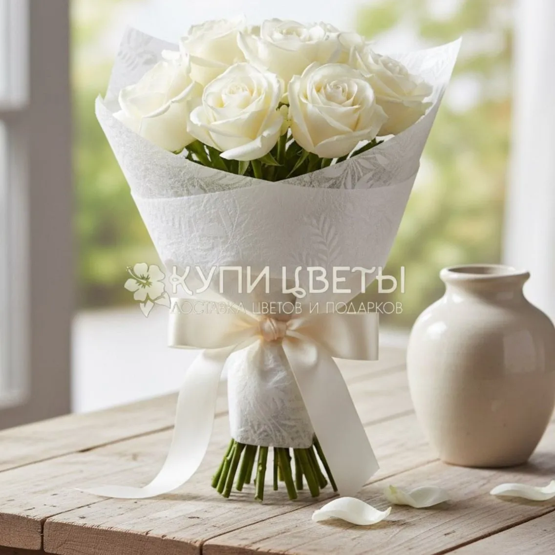 7 белых роз, упаковка
