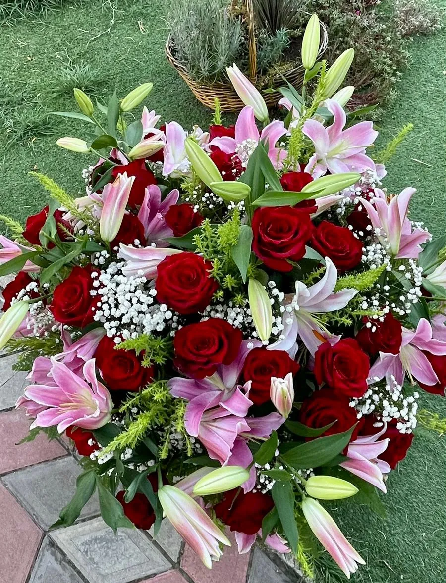 Вариант—Премиум - розы - 31 шт, лилия - 7 шт, гипсофила, корзина, оазис