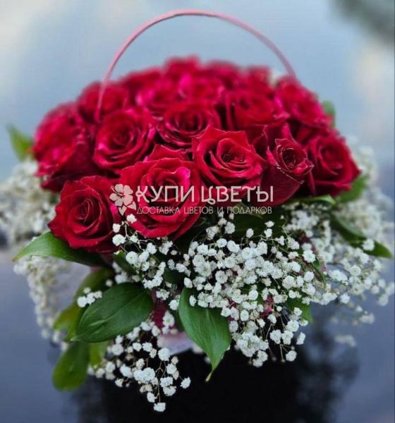 Когда слова не могут выразить всю полноту чувств, позвольте этому романтическому букету говорить за вас! Корзина из 25 алых роз, обрамленная нежным кружевом гипсофилы, – это воплощение искренней любви, романтики и признания. Каждый лепесток красной розы говорит о вашей страсти, а легкие веточки гипсофилы – о хрупкости и чистоте момента. Это прекрасный подарок, который создаст атмосферу счастья и незабываемой романтики.