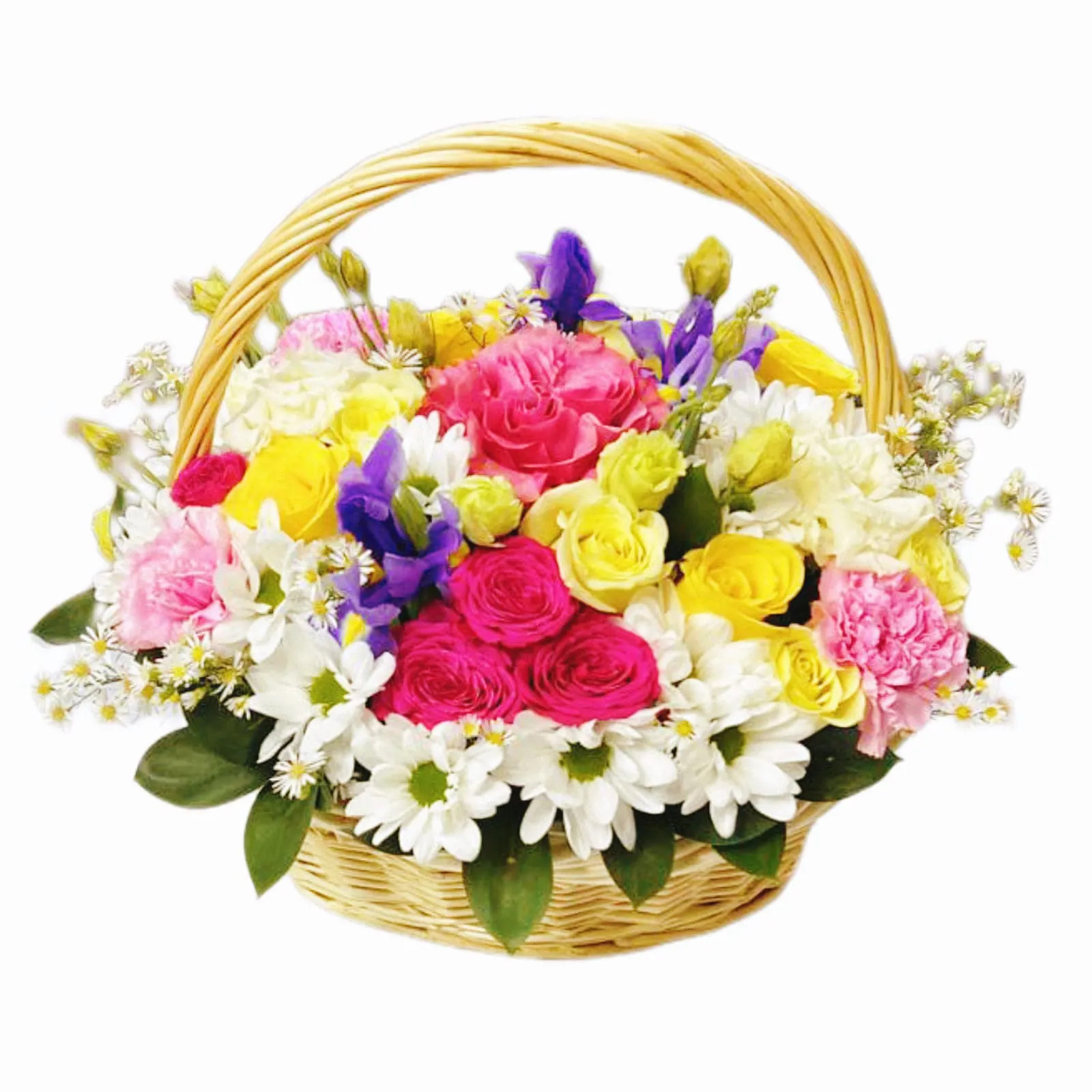 • Стандарт - роза - 7 шт., эустома - 3 шт., хризантема - 3 шт., ирис - 3 шт., гвоздика - 3 шт., салал, оазис, корзина