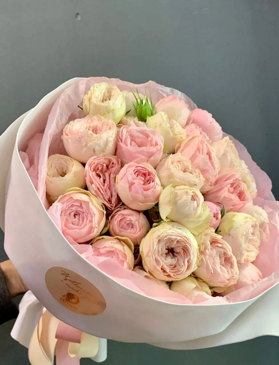 Кустовая пионовидная роза, упаковка, лента
