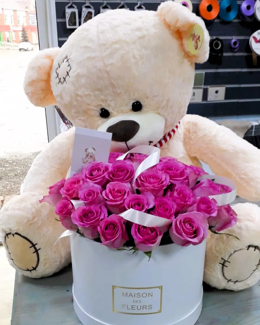 25 роз, шляпная коробка, оазис + мягкая игрушка 70 см