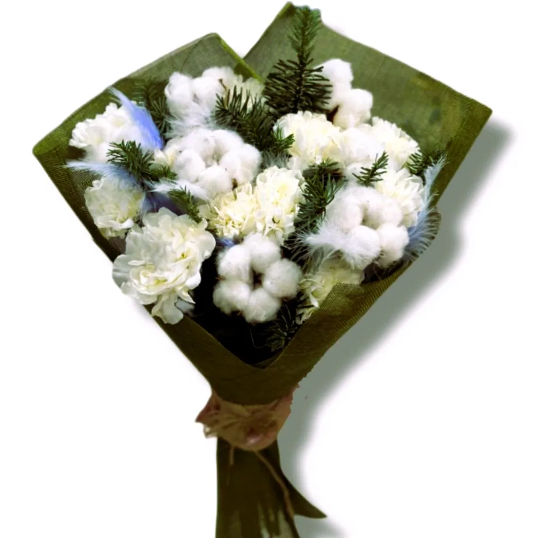 Создайте волшебное новогоднее настроение с нашим уникальным новогодним букетом, в состав которого входят изящные диантусы, мягкий хлопок и элегантный нобилис.