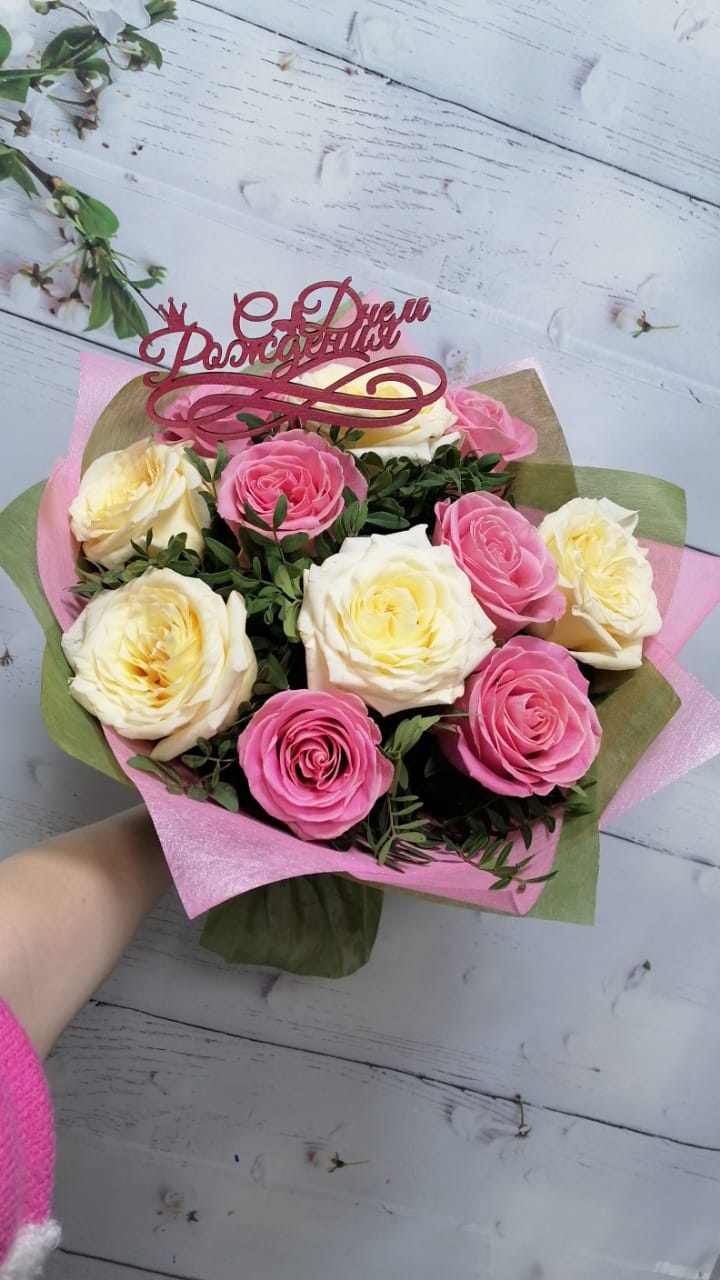 Букет из розовых и белых роз в подарок на день рождения
