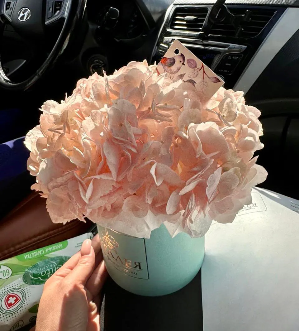 • Стандарт на фото( гортензия - 1 шт., шляпная коробка, оазис )