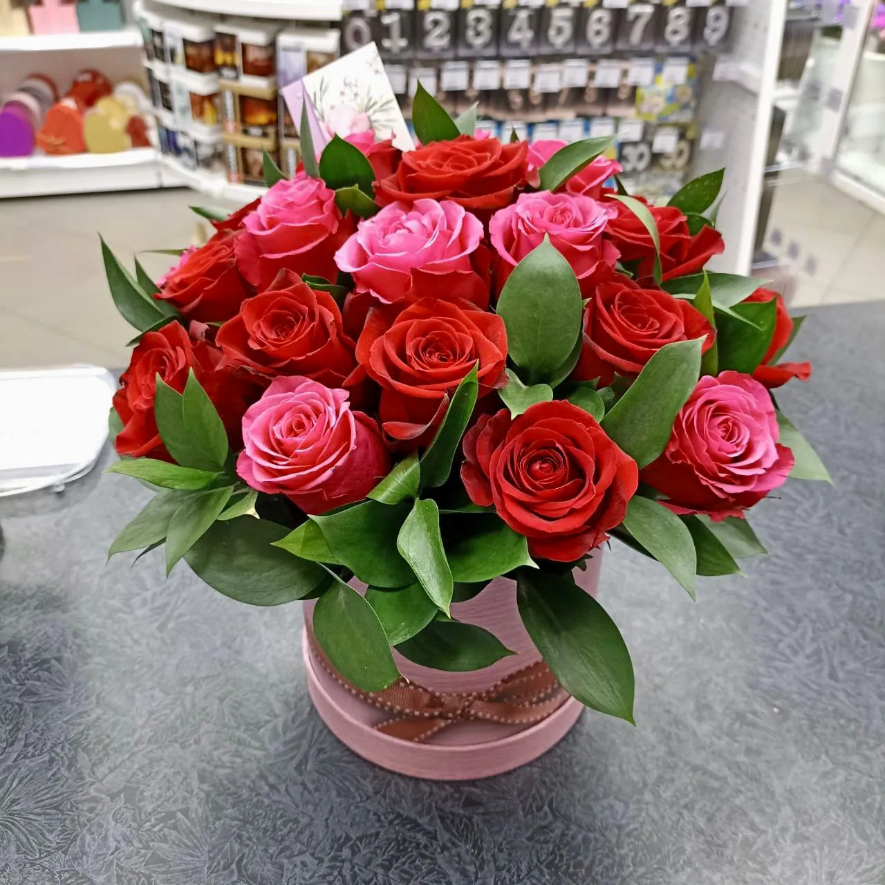 • Средний - роза - 15 шт., зелень, оазис, шляпная коробка