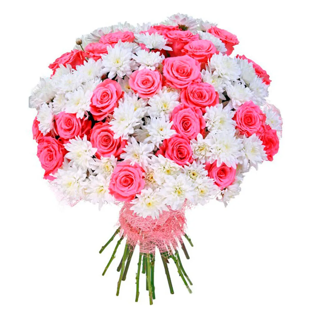 Этот букет из розовых роз и белых кустовых хризантем - воплощение изысканности и элегантности. Розовые насыщенные цвета символизируют любовь и заботу, в то время как нежные белые хризантемы раскроют чувство доверия и благодарности, радуя своей красотой и нежностью. Такой букет станет прекрасным подарком для вашей любимой девушки, мамы, бабушки, наполняя их сердца радостью и теплом.