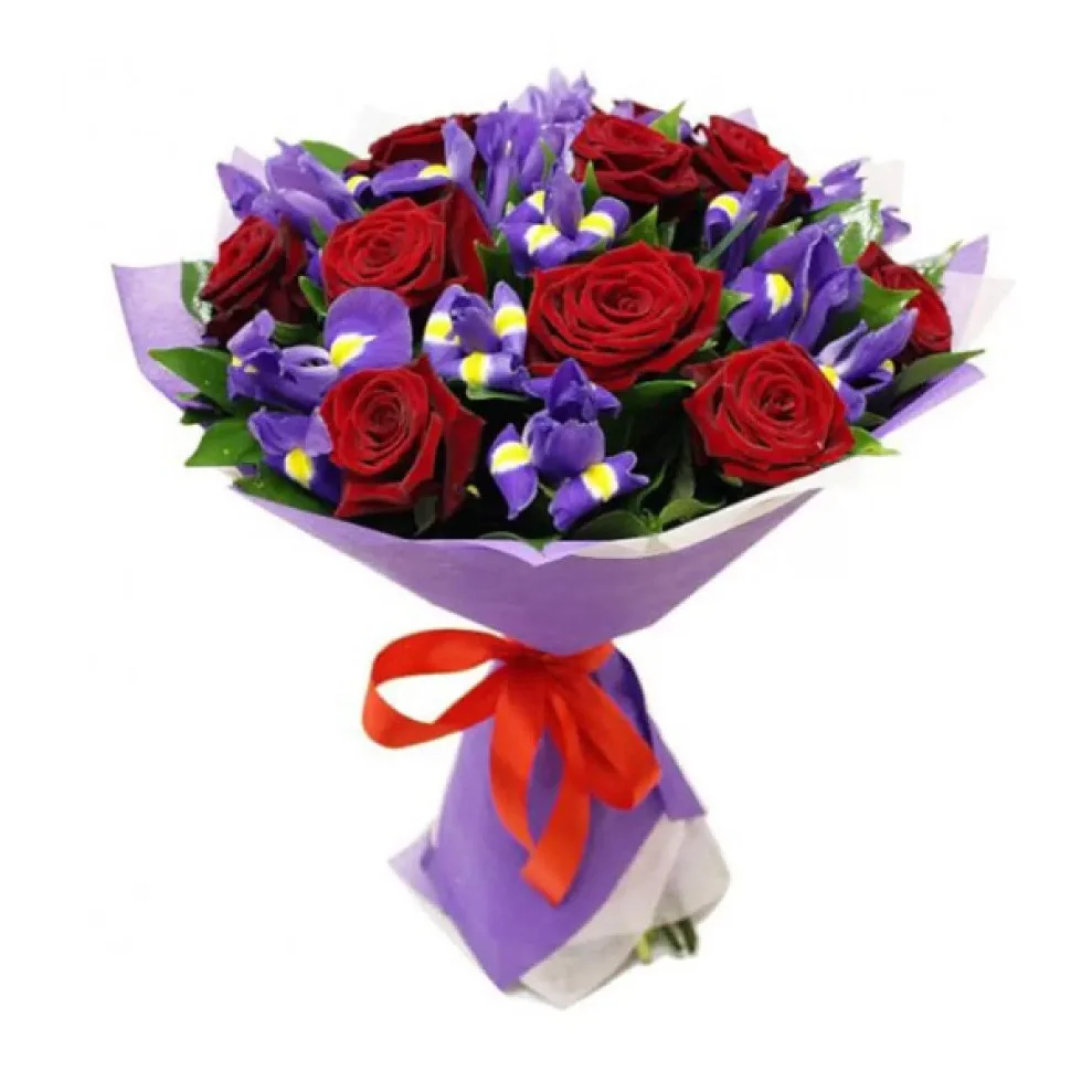 - Средний - роза - 7 шт., ирис - 12 шт., зелень, упаковка, лента