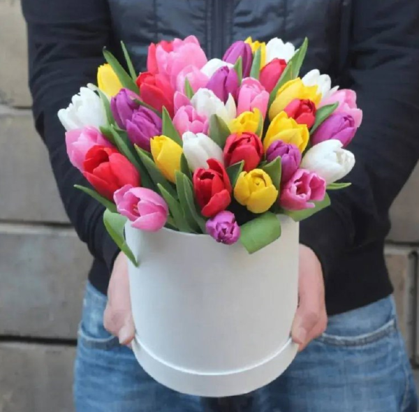 Шляпная коробка с разноцветными тюльпанами — яркий весенний комплимент, который говорит о чувствах без лишних слов. Нежные бутоны в сочной палитре создают эффект «букета-сюрприза», а стильная коробка делает композицию готовым подарком: удобно дарить, легко поставить дома или в офисе. Подойдёт для дня рождения, 8 Марта, свидания или просто чтобы порадовать близкого человека.